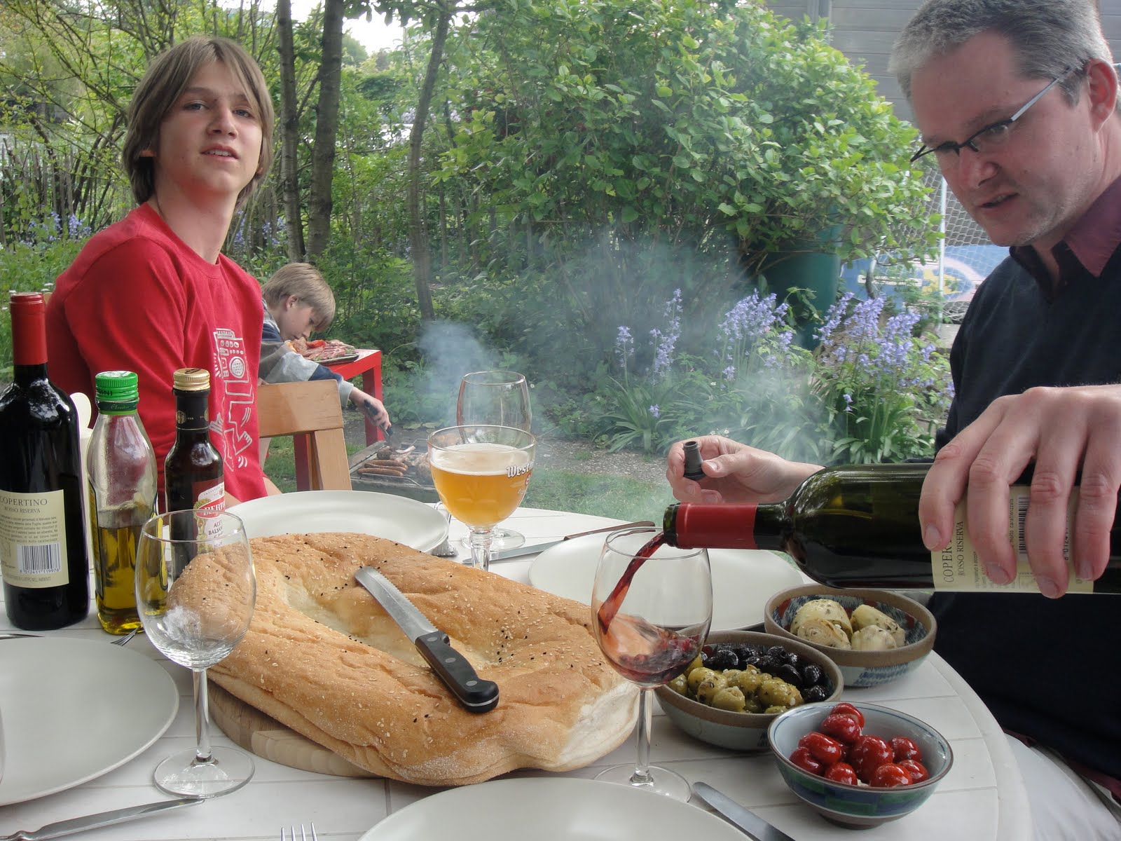 インゲさんは友だちとボート漕ぎに行っていて留守だったのでディックさん、バーツ君、クン君がバーベキューの用意をしてくれる。大きなトルコのパンやワインも美味しかった。